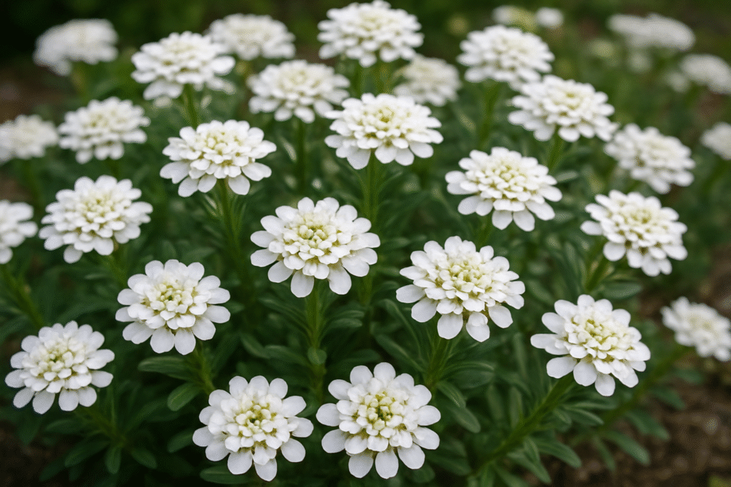 - Iberis sempervirens (Evergreen Candytuft): This low clump spreads well and stays green all year. White flower heads appear from mid-spring until autumn. Works nicely at the edge of borders or in containers.