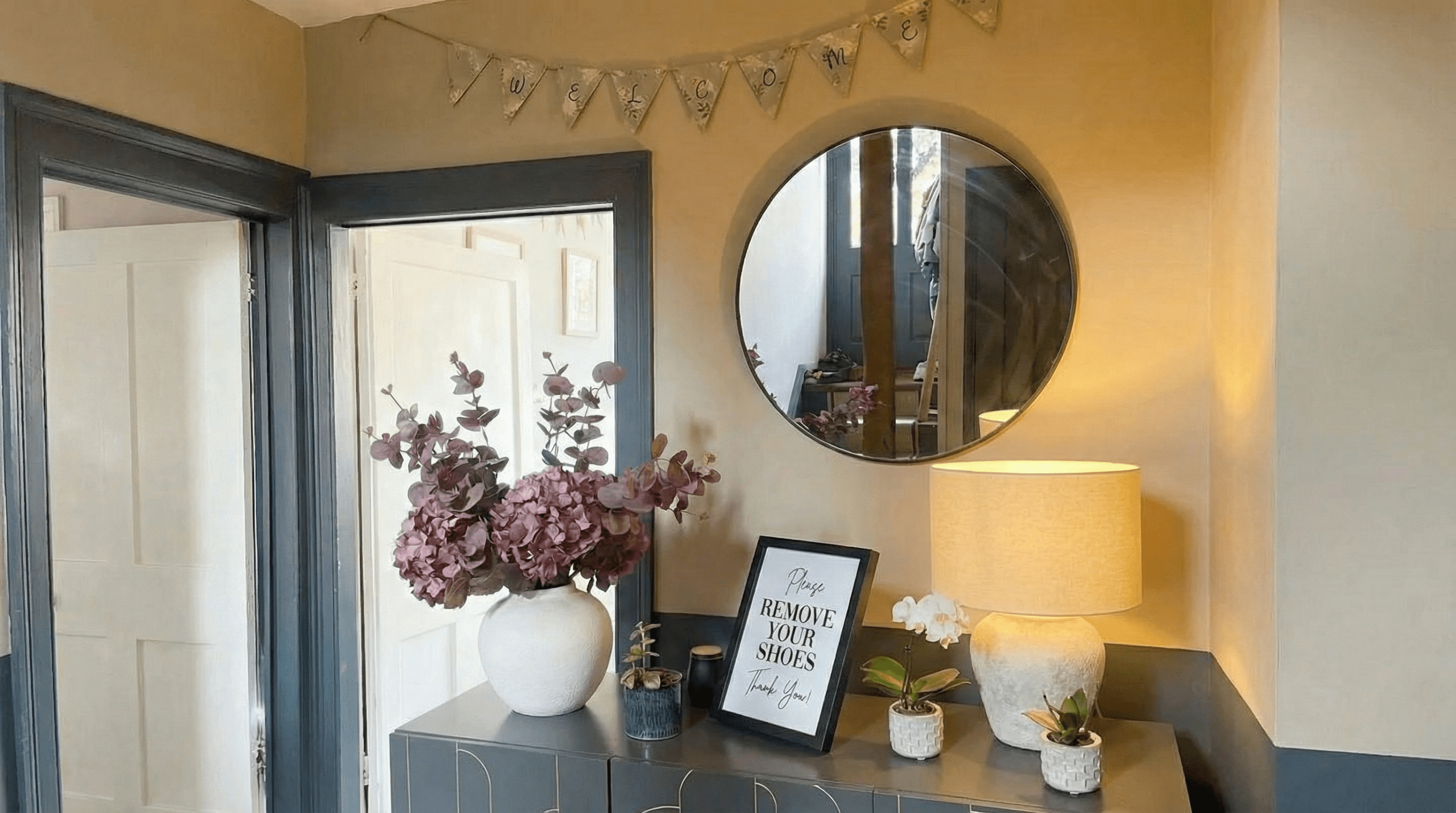 Small indoor plants on our sideboard in our hallway with artificial stems in a vase for decoration.
