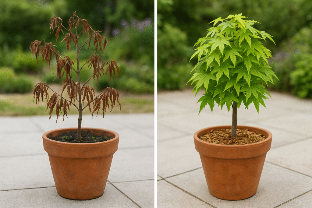 That experience taught me an important lesson: even the hardiest potted plants need protection from intense summer sun. Now, before the heat really sets in, I make sure to move my Acers from the roof garden into a cooler, shaded area and mulch around their roots to keep them hydrated and happy.