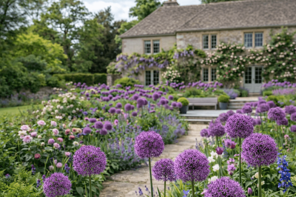 | Alliums | Late spring | 30–120 cm (12–48 in) | Dramatic globe flowers; great height in borders | Well-drained soil; sunny position |