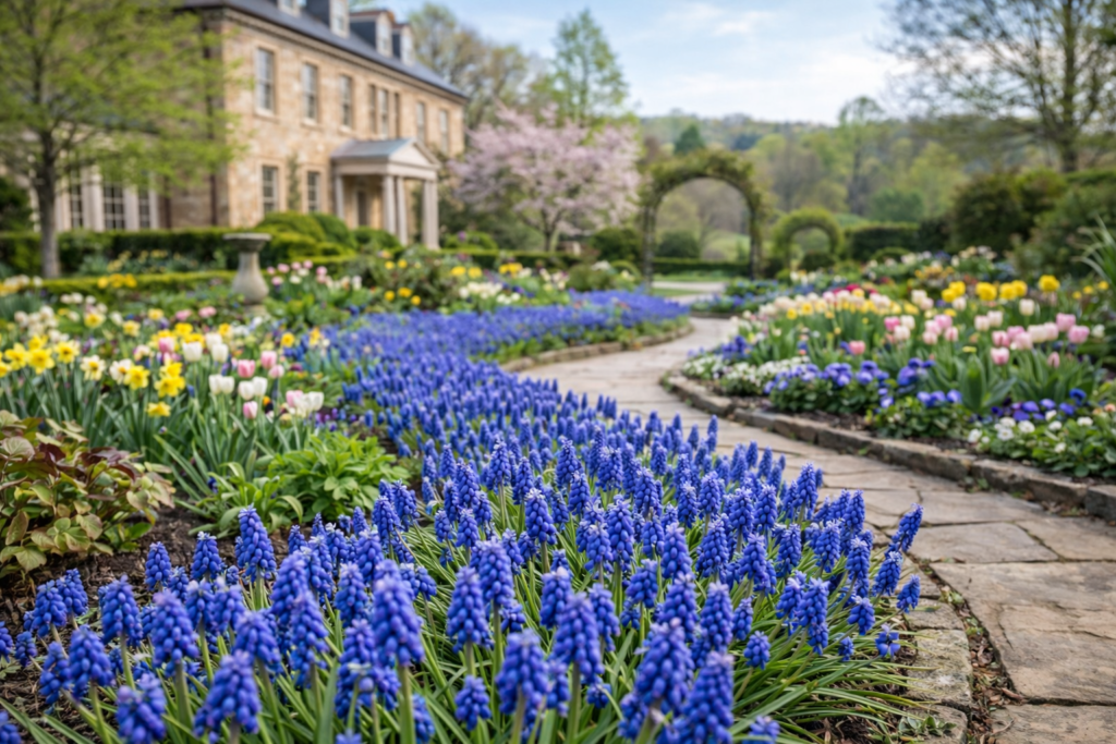 | Muscari | Early–mid spring | 15–20 cm (6–8 in) | Clusters of grape-like blue flowers | Easy care; tolerates poor soil |