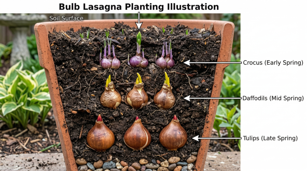 - Layer bulbs at different planting depths for multistage blooms (“lasagna planting”).