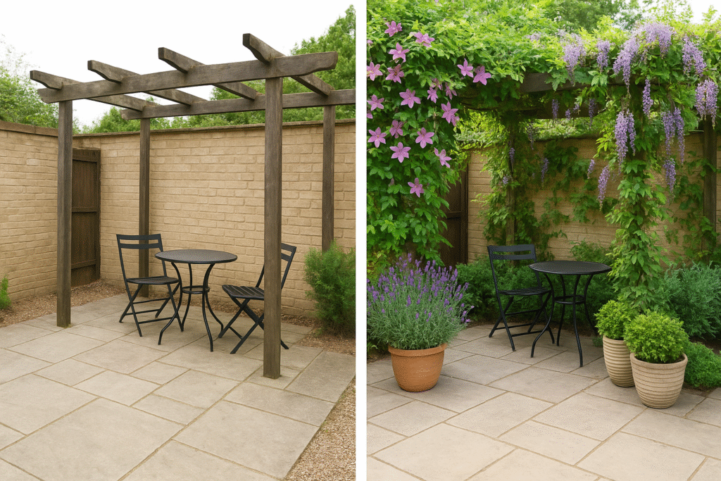 A before and after representation of what you could achieve for your own Outdoor Living Space by adding some of your favourite greenery.